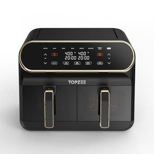 TOPZEE 8 QT Large Air Fryer. Dual Basket Airfryer with Easy View Windows. Preheat. Air Fry. Roast. Broil. Bake. Dehydrate. 2 Independent 4 QT Nonstick Dishwasher Safe Baskets. w/Glod Border
