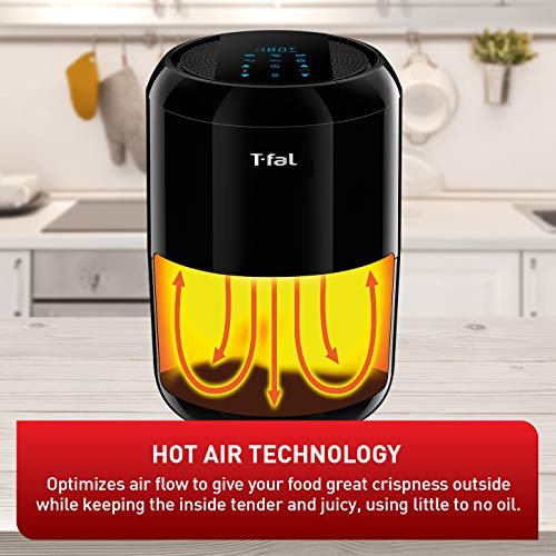 T-fal Infrared Air Fryer. Premium Infra-heat Technology. 7-in-1. 5L/ 5.3 QT. No-Preheating. Visible Window. 7 Cooking Programs with Extra Crispy Finish Program. Faster. Juicier. Crispier. Black