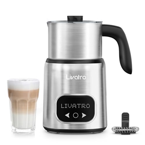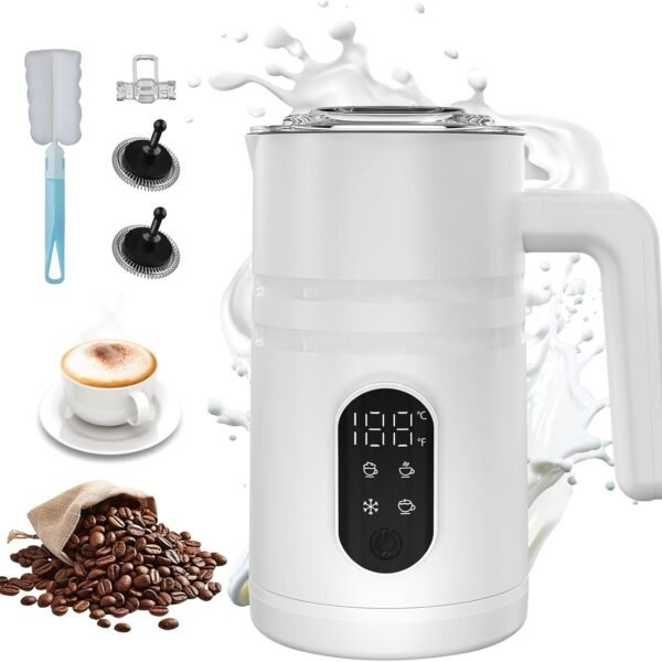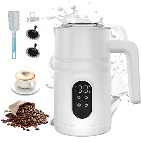 4 in 1 Electric Milk Frother Automatic Hot & Cold Foam Maker Auto Shut-Off Durable Stainless Steel Milk Frother Silent Working Easy to Clean for Hot Chocolate (White-with Digital Display)