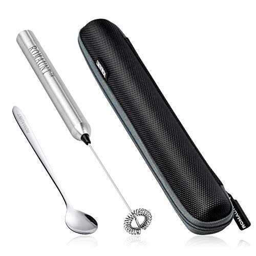 (With Case & Spoon) – Handheld Milk Frother ROMAUNT Electric HandHeld Battery Operated Portable Mini Mixer Machine Milk Foamer for Coffee Latte 304 Stainless Steel Whisk with Protective Case. Mix Spoon for Travelling or Camping
