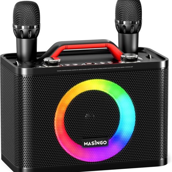 MASINGO New Karaoke Machine for Adults and Kids with 2 Wireless Microphones. Portable Bluetooth Singing Speaker. Colorful LED Lights. PA System. and TV Cable. Sonoro G5