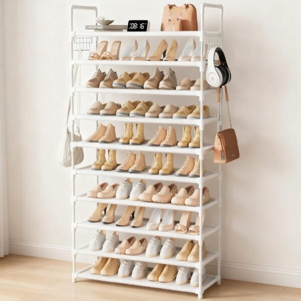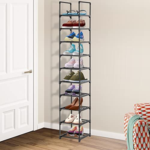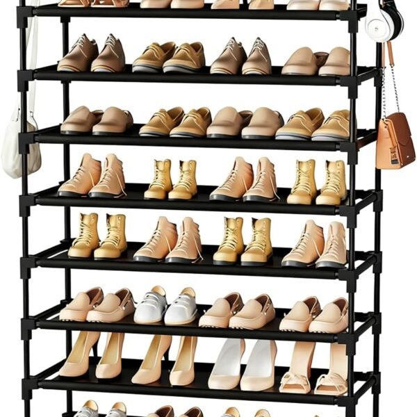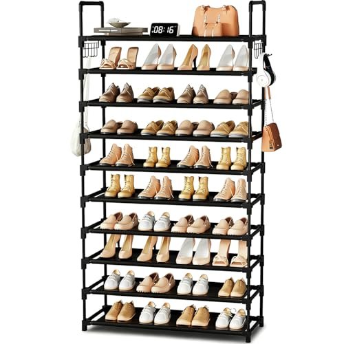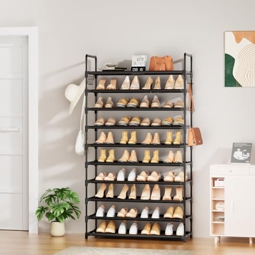10 Tier Shoe Rack. Large Capacity Tall Shoe Storage Organizer Holds 50-55 Pairs Shoes and Boots. Vertical Shoe Shelf Cabinet with Versatile Hooks for Closet Entryway Garage Bedroom