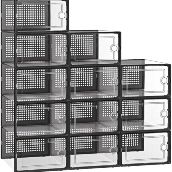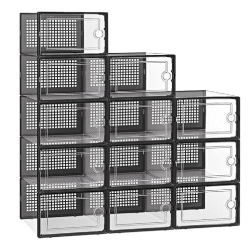 12 Pack Shoe Storage Box Clear Plastic Stackable Shoes Organizer for Cabinet Closet Space Saving Foldable Sneaker Organizers Containers Display Case Holders Boxes